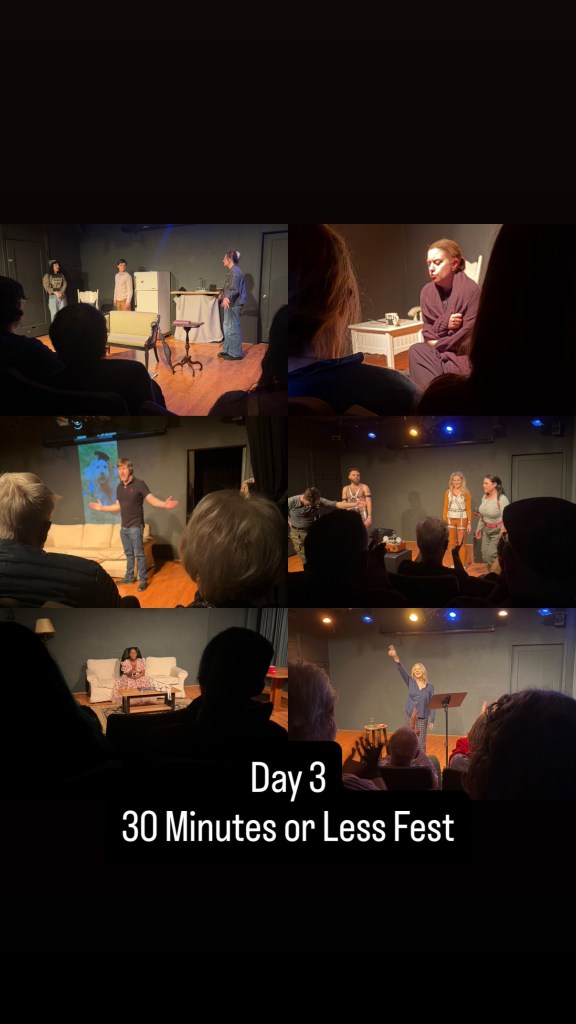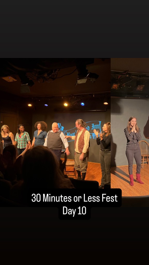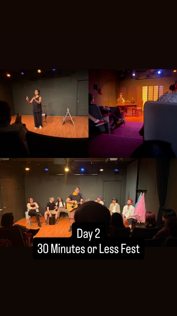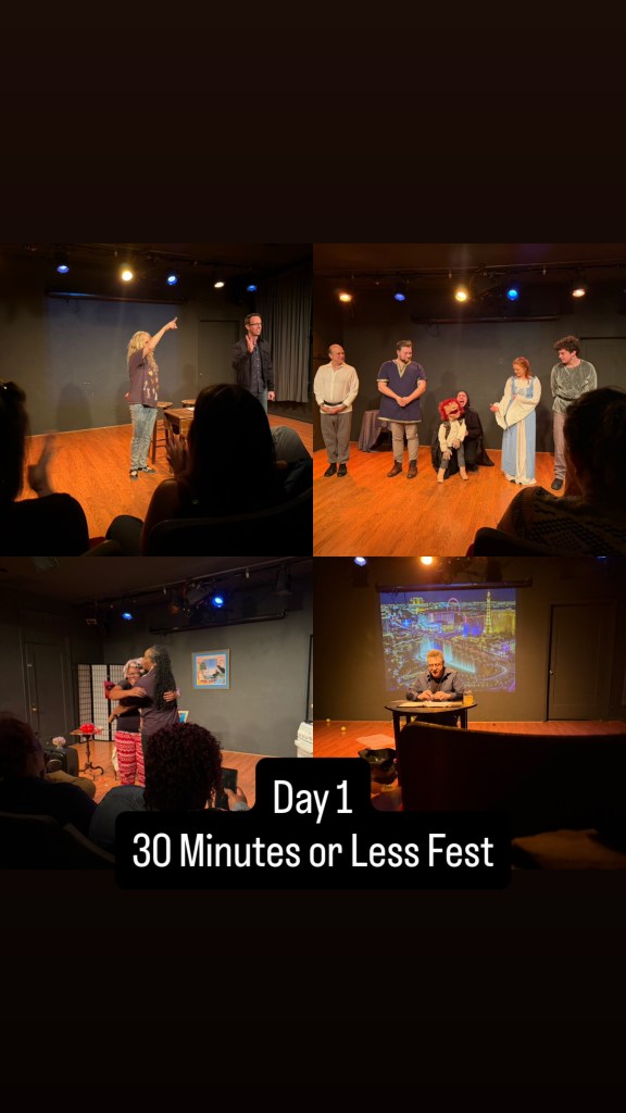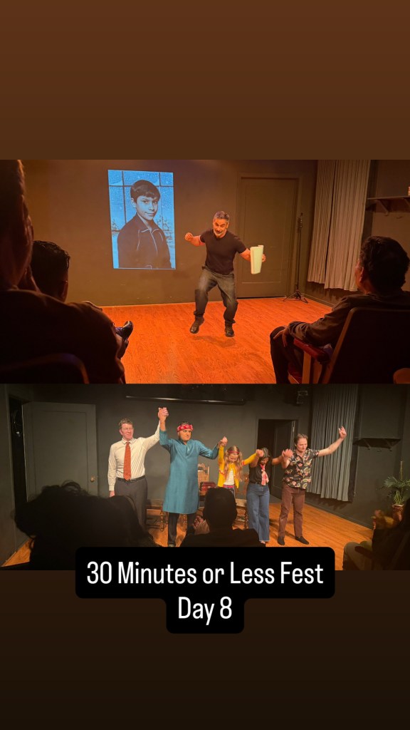 Weekend 1 of the 30 Minutes or Less Fest is over at The Stephanie Feury Theater and some great work has been produced, which might have other showings next week. I want to write little blurbs for each show with the hopes that it may pique your interest. I don’t think I will be returning until this coming Thursday. Mind you, I go into these shows knowing nothing. I probably know a few actors. Very grateful to Matthew Quinn and Bertha Rodriguez for setting this up. (Submitting this without reading through because I want to meet my deadline — if I have misgendered anyone, or spelled names incorrectly, or told lies, please do tell me so that I can edit; and happy to do so).