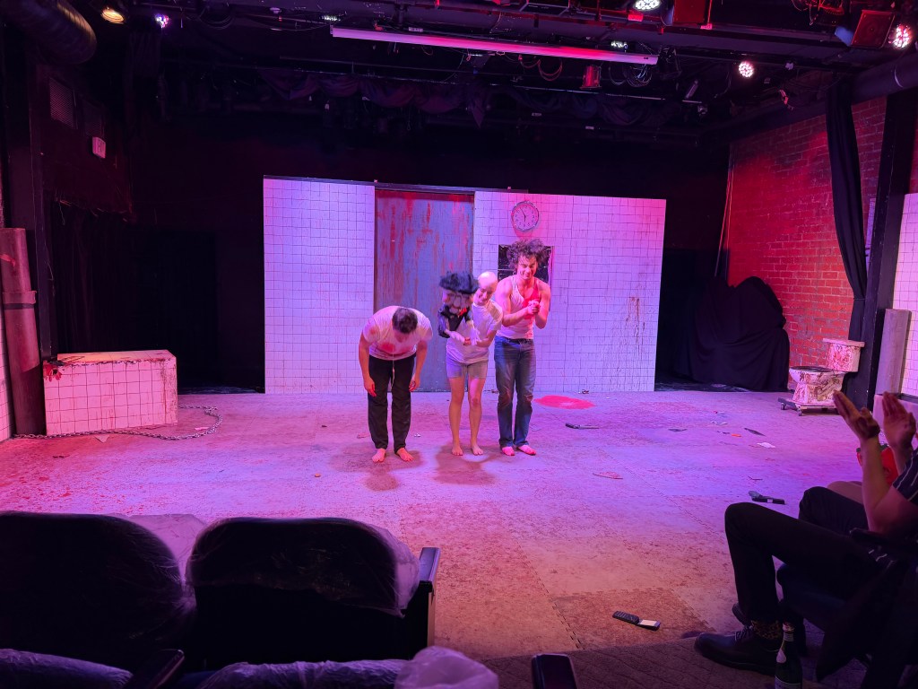For the bulk of the runtime (a whopping just about 2.5 hours or so) the structure follows to men chained to opposite sides of the room. Their darkest secrets and sexuality shine with humor as the play moves along. The cast frequently breaks the fourth wall, but does so with intention and timing, creating a playful relationship with the audience rather than cheap winks. I really liked all of the actors, no notes. The three performers play multiple characters (for the most part) and I was pleased with how far these actors were able to take their roles. Fun effects were used and the first two rows were considered “splash zones”.