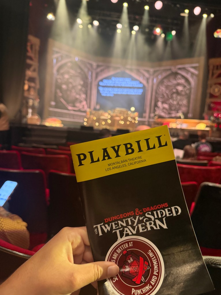 The cast was exemplary, fully committed to every bit and playful with the audience. The audience even voted which character the actors would play. Based on the program I would assume this is a rotating cast but they all seemed to have great chemistry with each other. We even got two special guests who commanded the stage! (Forgive me, I cannot remember who those celebrities were). I could not tell you where the plot went, or how we got from here to there, because I was just having so much fun and so involved in voting for these character’s choices. Several audience members got to go on stage and help ther characters on their journey. A truly one of a kind theatrical experience and probably a dream come true for any technical designer, prop master, etc. as they too were able to play with the cast. My hat goes off to the dungeon masters and the players who brought magic to the stage with comedy.